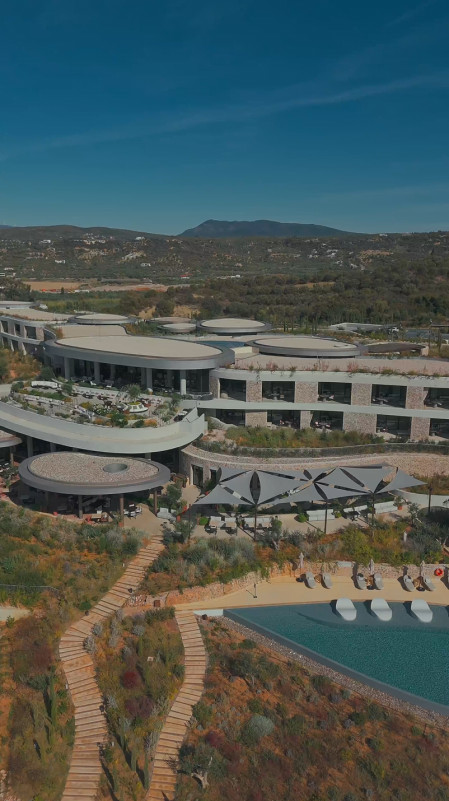 Located in Navarino Bay, the resort is surrounded by olive groves, rolling hills, and the tranquil blue waters of the Ionian Sea. The architecture draws inspiration from the local landscape — villas and suites are harmoniously integrated into the earth, offering panoramic sea views while preserving the natural scenery. Every detail, from the materials to the lighting, reflects a deep respect for the region’s history and environment.